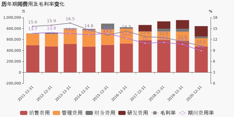 公司2020年营业成本848.1亿,同比增长7.9%,高于营业收入6.4%的增速,导致毛利率下降1.3%。期间费用率为8.9%,较去年下降1.8%,费用控制合理。公司本期研发投入为25.1亿,同比上升17.2%。研发投入资本化比例为24.8%,资本化比例较高。