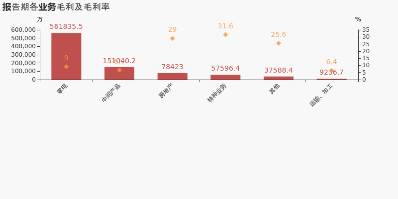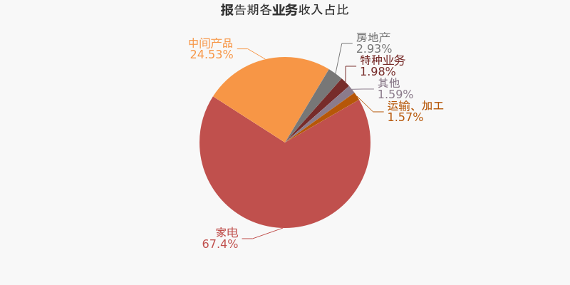 从业务结构来看,“家电”是企业营业收入的主要来源。具体而言,“家电”营业收入为621.1亿,营收占比为67.4%,毛利率为9%。